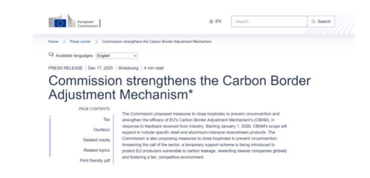 12月17日,欧盟委员会公布碳边境调节机制(CBAM,又称“碳关税”)的调整方案,计划在现有框架上扩大覆盖范围并强化反规避措施。CBAM自2023年10月进入过渡期,主要针对水泥、钢铁等从碳排放限制较宽松国家和地区进口的产品征税。新方案则将覆盖范围从铝、水泥、电力和钢铁等基础材料,延伸至包括机械、五金、车辆零部件、家用电器及建筑设备等在内的180种钢铁和铝密集型下游产品。在反规避方面,欧盟将消费前金属废料纳入核算范围,加强报告要求并提升商品可追溯性,以应对虚报排放等问题。此外,欧盟拟设立“临时脱碳基金”,资金部分来源于2026年至2027年CBAM证书销售收入,用于支持本土生产商。2026年1月1日起,CBAM将正式进入强制征收阶段,成为全球首个跨境碳关税制度。